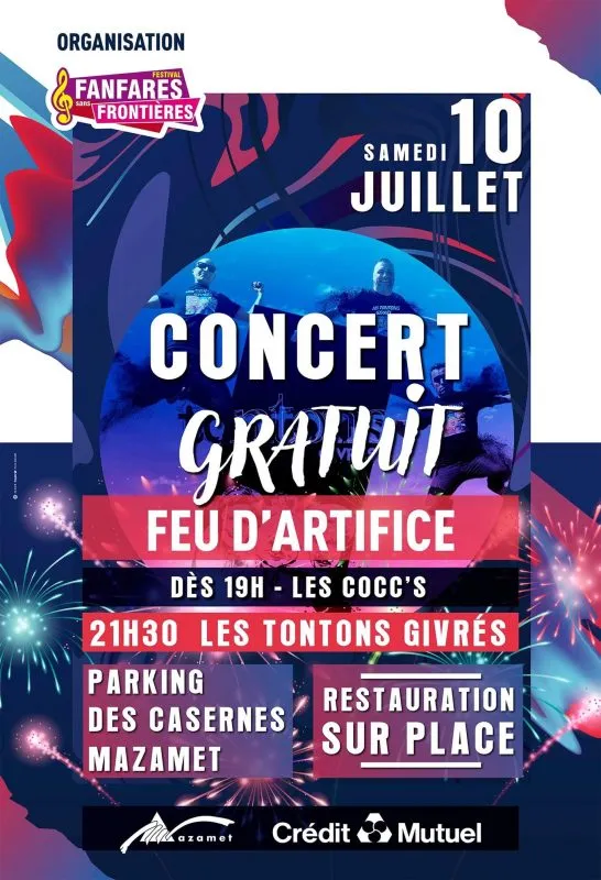 Cette année encore, point de festival Fanfares Sans Frontières animant les rues de Mazamet. Le comité a tout de même décidé d’organiser un concert gratuit le samedi 10 juillet sur le Parking des Casernes en centre-ville de Mazamet. Rendez-vous donc à partir de 19h pour assister aux performances des Coccs’s (2 guitares, de l’harmonica et 3 voix !) et des Tontons Givrés (chansons françaises survitaminées pour une folie collective), puis, pour couronner le tout, un feu d’artifice organisé par la Ville.