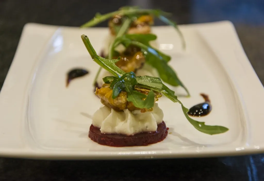 A sneak peek into our spring menu – Beetroot and goat’s cheese mousse topped with candied walnut.