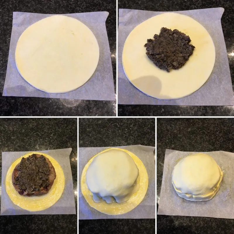 To construct - add a tablespoon of duxcelle in the centre of a disc of pastry (one on a piece of baking paper); add a piece of beef and top with a further tablespoon of duxcelle, gently spread over the surface of the filet. Brush the edge of the pastry with beaten egg yolk.