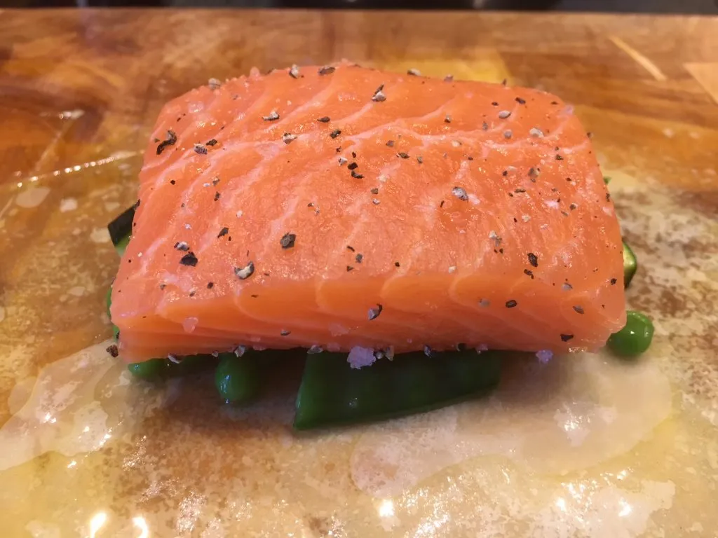 To cook the salmon parcels, pre-heat your over to 220. Place the baking sheet containing your parcels in a middle shelf and cook for 15 mins (you may need to turn the oven back to 200 after a few mins if your filo is colouring too quickly)