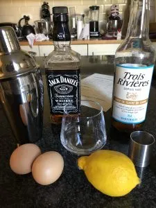 - Add your sugar syrup, lemon juice, egg white and whisky to a shaker tin.