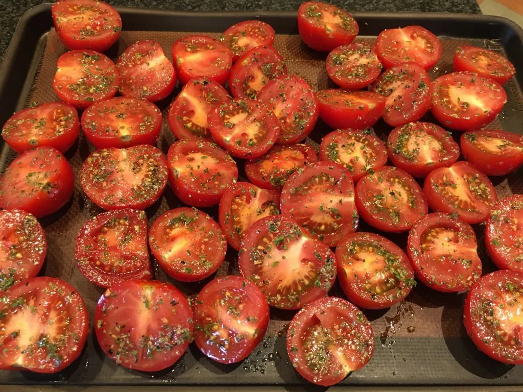 Heat your oven to 200. Place the halved tomatoes into a large bowl, drizzle with olive oil and toss with salt, pepper plus the thyme & oregano.Place the tomatoes on a baking sheet - pop in the oven for 20-30 mins until the tomatoes soften.