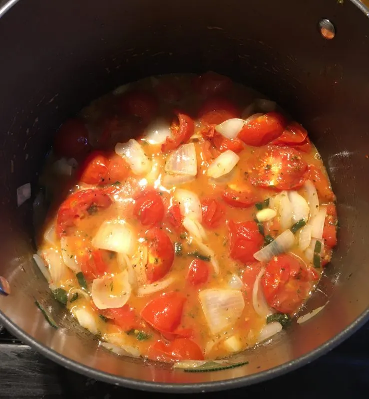 While the tomatoes are cooking; heat a large pan with the butter and a little olive oil; add the onion & garlic and sweat down. Once the tomatoes are cooked, add those to the pan, stir well to combine adding the sage, stock & finally the gin. Simmer away for 20 mins.