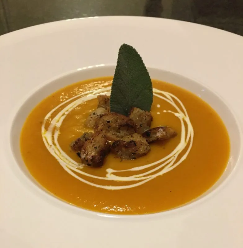 Blend the soup until smooth; serve in warmed bowls with freshly made croutons, decorated with a sage leaf & a drizzle of cream.
